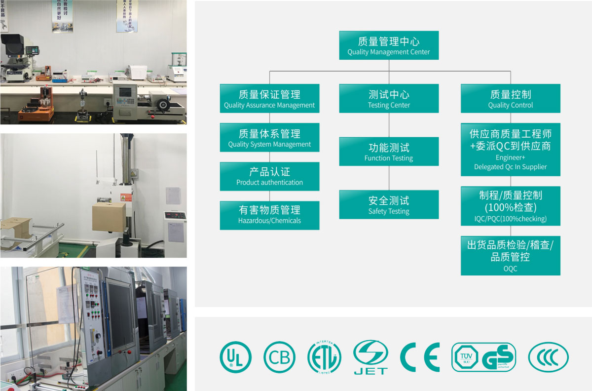 公司視產(chǎn)品質(zhì)量為企業(yè)生命,始終以“質(zhì)量第一、用戶至上”為宗旨,建立完善質(zhì)量管理體系,不斷提高全員質(zhì)量意識(shí),嚴(yán)格按照國家質(zhì)量標(biāo)準(zhǔn)組織生產(chǎn),已經(jīng)引入了信息化質(zhì)量管理系統(tǒng)(QMS),從進(jìn)料檢驗(yàn)、首件檢驗(yàn)、生產(chǎn)巡檢、出貨檢驗(yàn)、質(zhì)量分析及改善、品質(zhì)追溯等均形成實(shí)時(shí)大數(shù)據(jù)和信息流。公司已經(jīng)通過了So9001、1SO14001、BSC等體系認(rèn)證,公司產(chǎn)品取得了JQA、JET、CC、UL、CB等產(chǎn)品認(rèn)證。